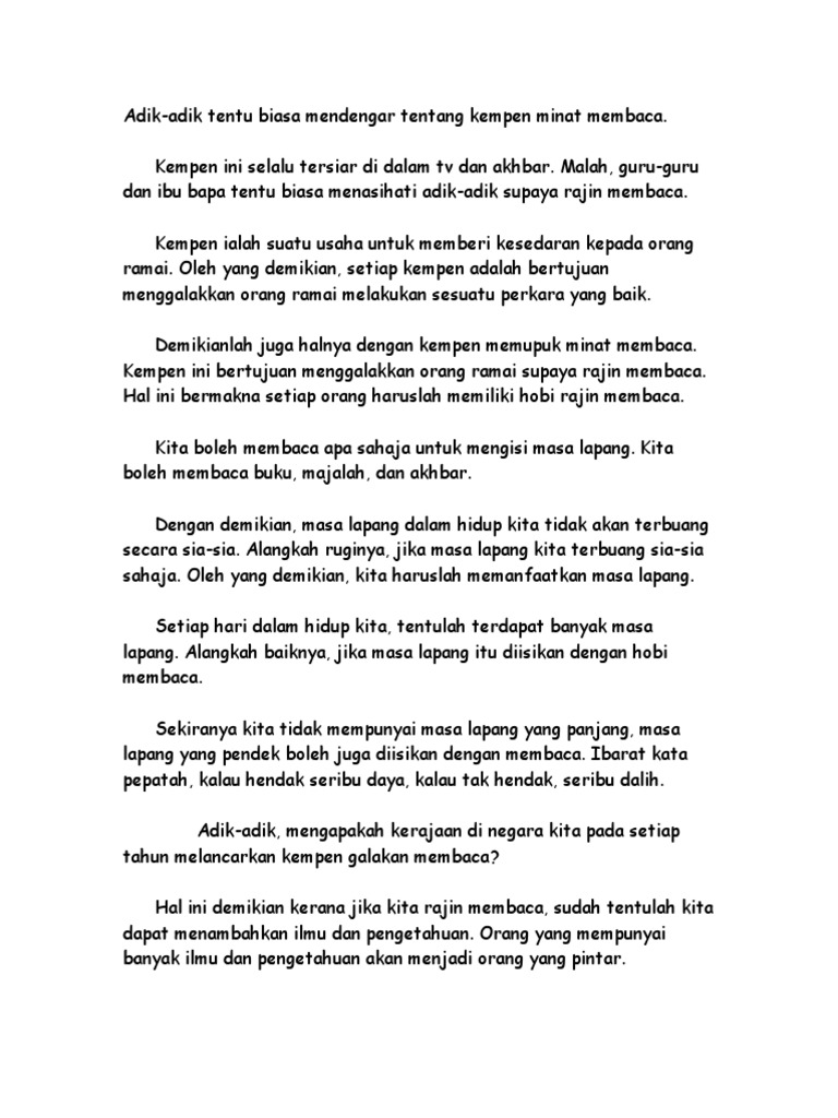 Karangan SPM Langkah Pencegahan Penyakit berjangkit. Ini juga satu aktiviti yang dapat mengeratkan hubungan antara ibubapa dan anak. Walaupun pelbagai usaha telah dilakukan oleh pihak berkuasa dalam memupuk amalan membaca namun budaya membaca dalam masyarakat masih rendah.